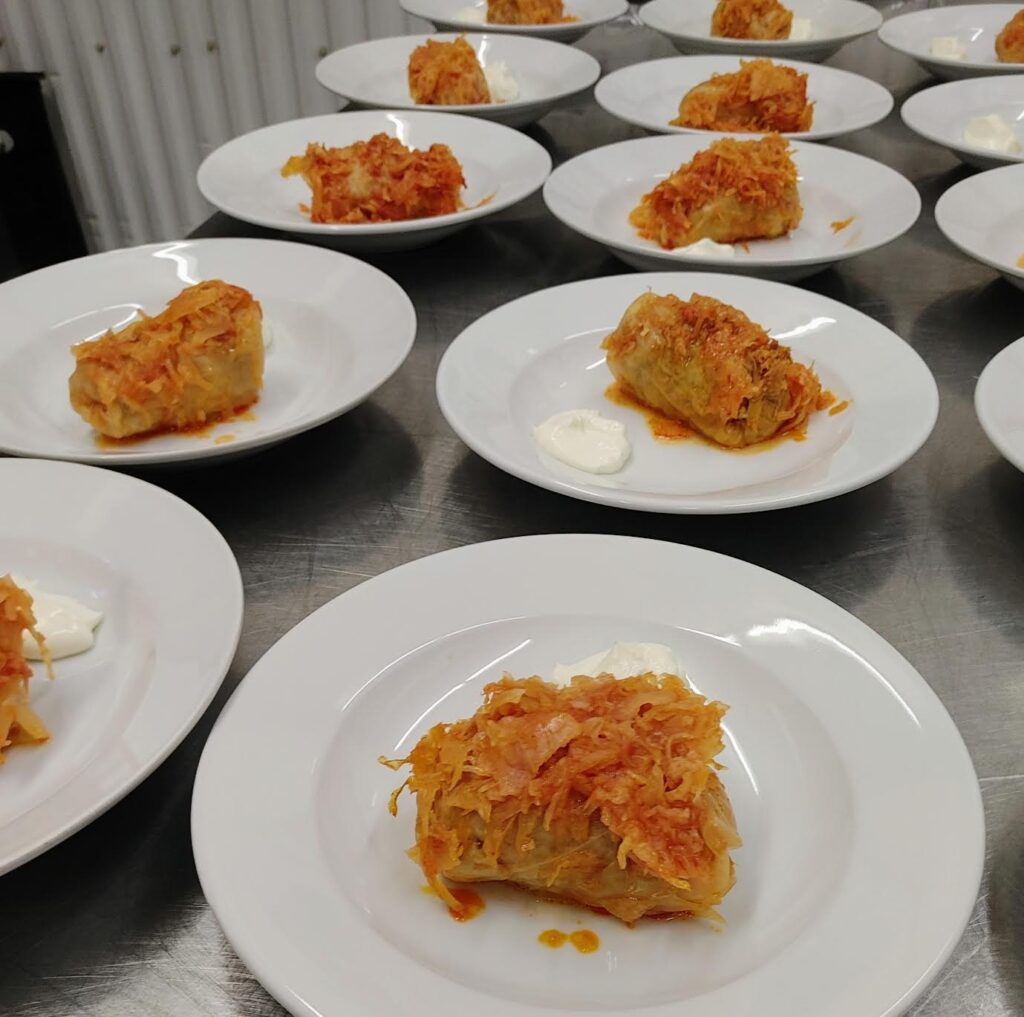 Delicately crafted and steeped in tradition, our Hungarian töltött káposzta features tender cabbage leaves filled with a refined blend of seasoned pork, rice, and aromatic spices. Each roll is gently braised in a velvety, paprika-kissed tomato sauce, allowing the flavours to harmonize into a rich, savoury depth. Served with a touch of sour cream, this timeless dish offers an elegant taste of Hungary’s culinary heritage—comforting, flavourful, and truly unforgettable.